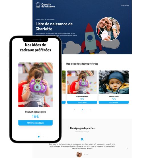 Une liste de naissance, un album photo, un faire-part digital, une invitation à la fête de révélation ou à l’annonce du prénom, un album photo ou un livre d’or pour collecter les voeux de vos proches. CagnottedeNaissance.fr vous propose tous les outils indispensables pour partager le bonheur d’une naissance !